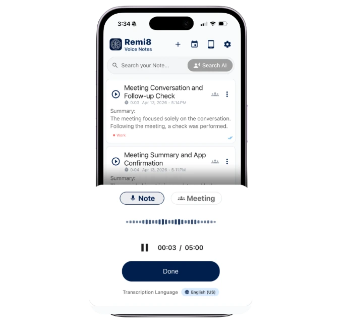 Remi8 is an AI note taker and voice notes app for busy professionals. Capture meetings and ideas by voice, let AI organize everything, and recall anything with natural questions.